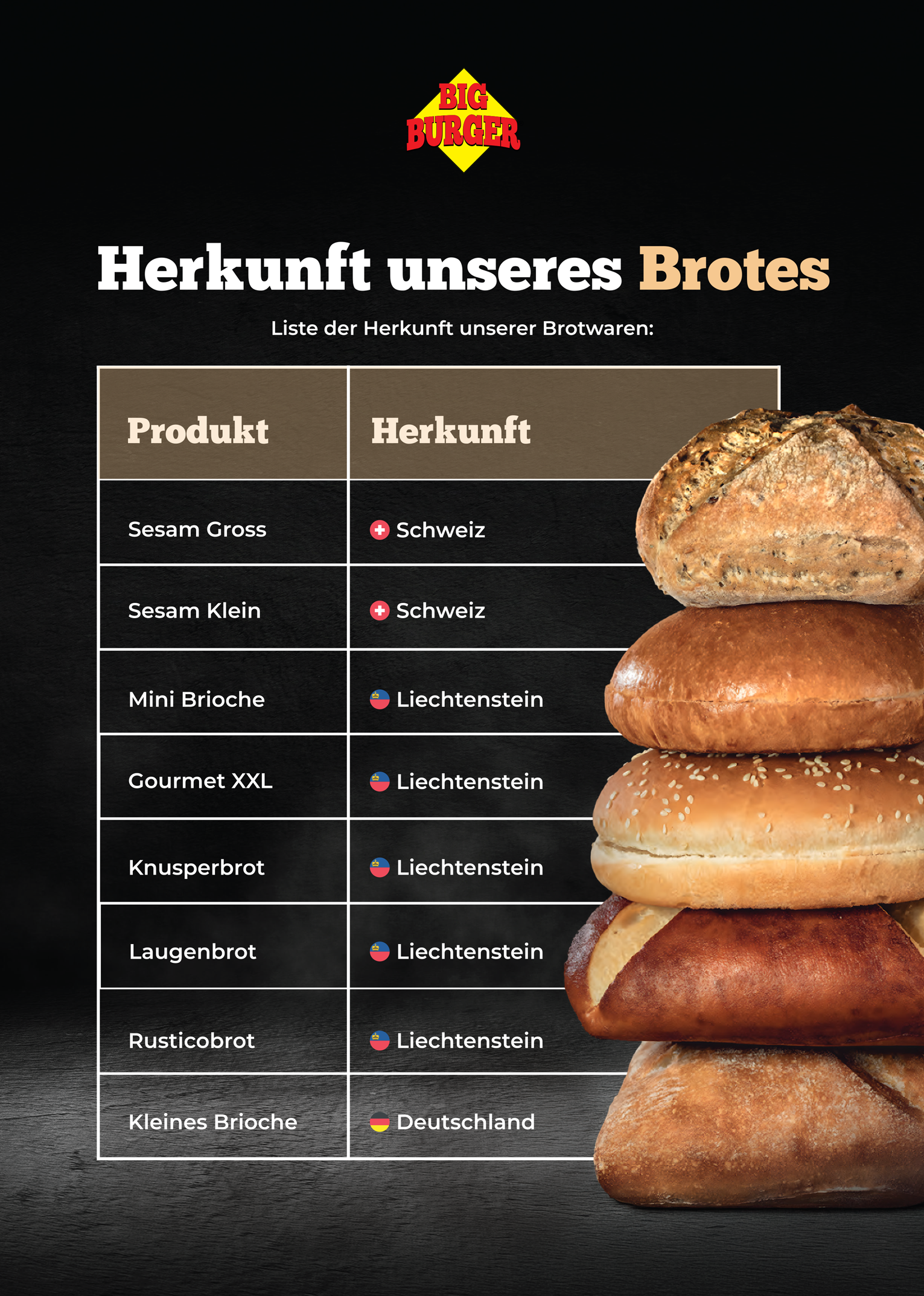 Wir grillen ehrlich: klare Herkunft, faire Partner. Hier findest du die aktuellen Angaben zu Herkunft unserer Produkte – frisch, nachvollziehbar, Big-Burger-Style.